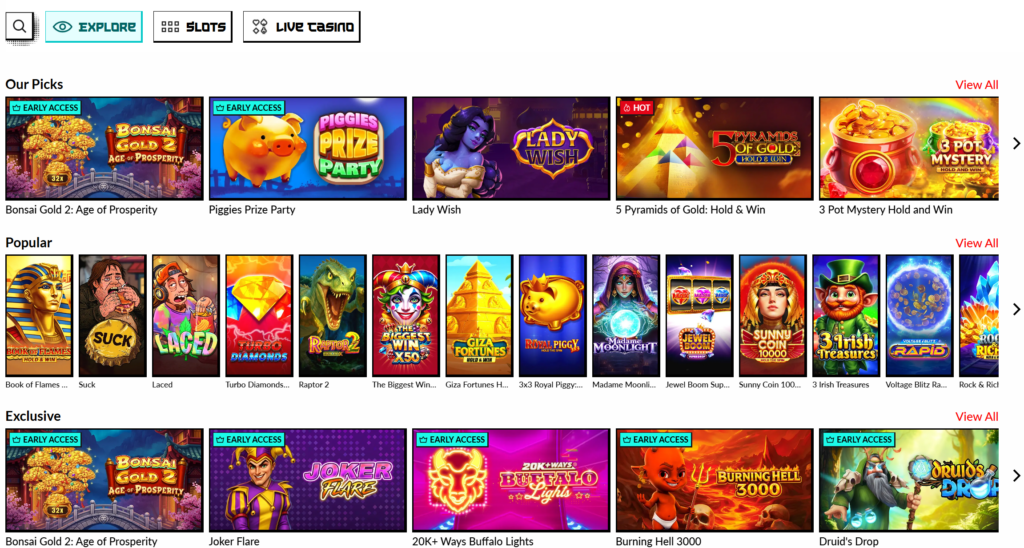 - Top-Tier Slots: Features over 4,000 slots including major titles from Pragmatic Play and Hacksaw.