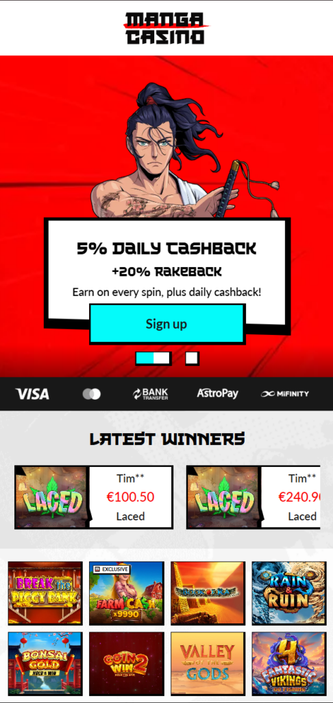 When I first accessed the site in April 2026, the vibrant manga artwork and Japanese-inspired design immediately caught my attention. Unlike competitors that pursue minimalist aesthetics, Manga Casino embraces colour and animation throughout its interface. This isn’t mere decoration—the theming extends to gameplay mechanics and promotional language, creating a cohesive brand experience.