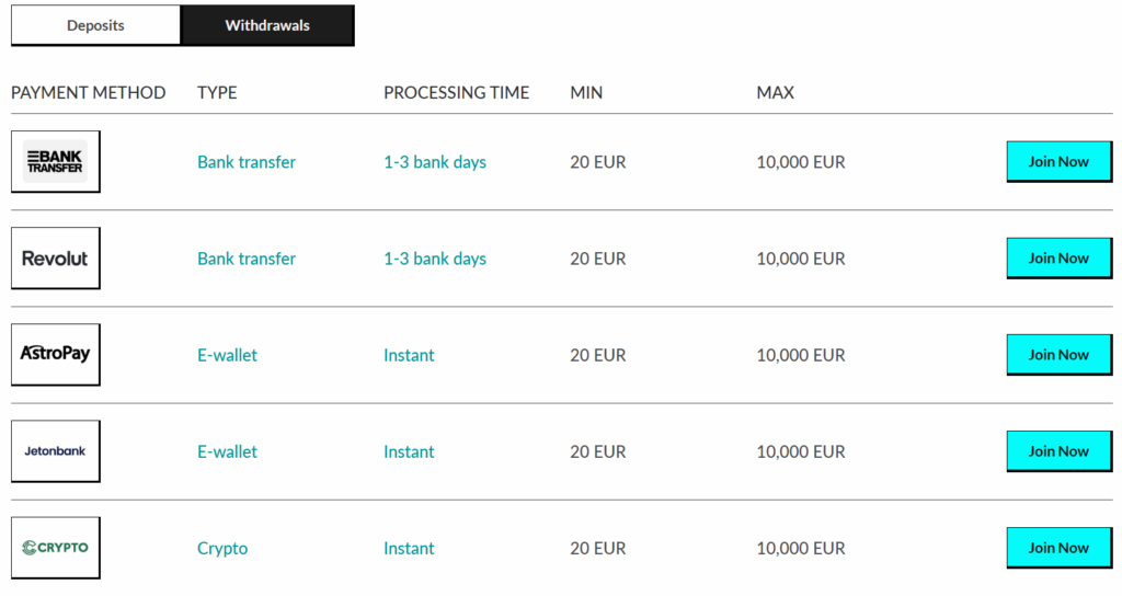 | Payment Methods | Credit/debit cards, e-wallets, bank transfers, 31+ cryptocurrencies |