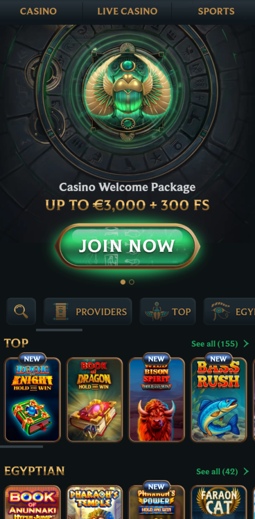 Upon first access in April 2026, I found Talismania’s black-and-green design evocative of Egyptian antiquity, with scarab beetles and pyramid imagery throughout. The aesthetic creates an immersive atmosphere, though some users might find the heavy visual styling demanding.