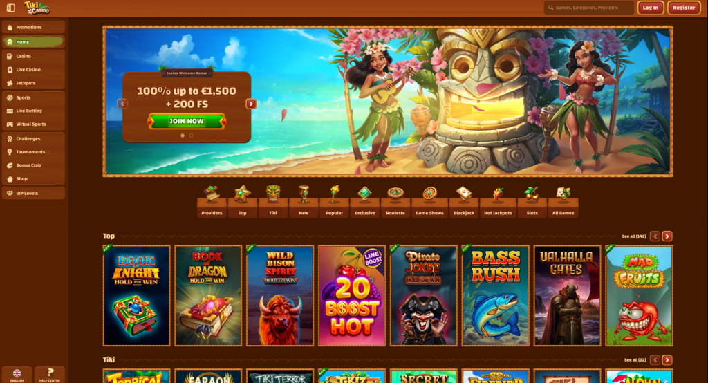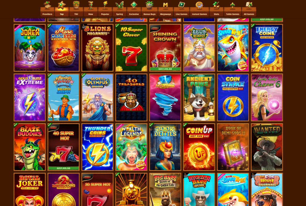 Mit 2.500+ Spielen bietet TikiCasino solide Vielfalt, obwohl sie kleiner als Mega-Casinos ist. Die Bibliothek umfasst Spielautomaten, Tischspiele, Live-Casino und einzigartige Game Shows. Beliebte Titel wie Gates of Olympus, Book of Dead und Pragmatic Play’s Drops & Wins sind verfügbar.